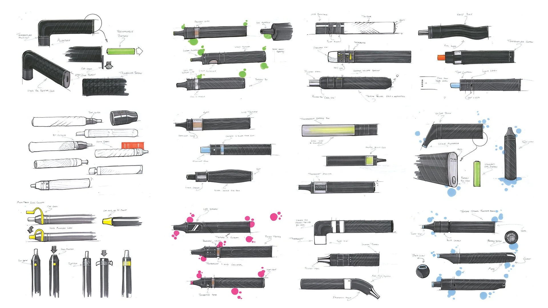Thumbnail sketches paved the way for a design direction. Innovative Luma methods such as affinity clustering revised and refined ideas. With digital interventions and physical modeling, a form was developed. CAD models of the E-CIGAR further refined the shape and other components. 3D printing validated the design which led to the finalized CAD model, rendering, and animation of the E-Cigar.