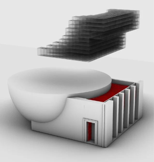 In a physical effort to unearth, a sphere intersects a cubic grid to create a positive and a negative. These two shapes inform and connect the palazzo and pavilion.