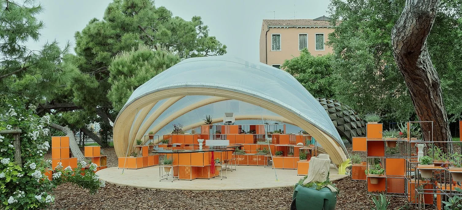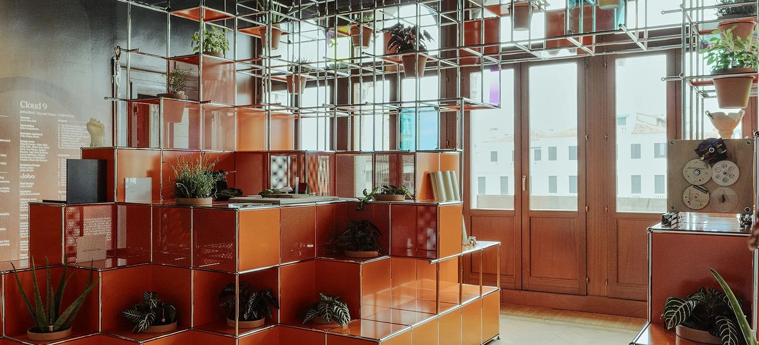 The Palazzo is designed in reference to a colosseum, which is an architecture intended for spectating; a perfect tool for witnessing natural phenomena. The furniture becomes lighter as it reaches the ceiling, creating a hierarchy that reflects the architecture in the garden. USM’s orange is used symbolically, representing earth and clay - material found as a physical result of digging or “unearthing”.